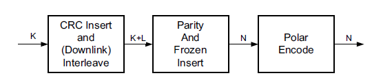 前級的傳輸塊信息bit,插入CRC校驗(yàn),下行鏈路還需插入交織,奇偶校驗(yàn)及凍結(jié)bit插入(非必須),再送入編碼器進(jìn)行編碼。