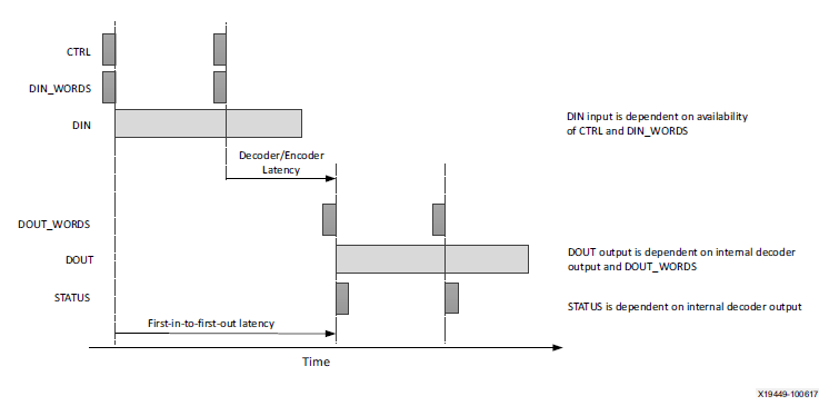 對于每個(gè)塊,在控制(CTRL)輸入流上需要一個(gè)輸入,指定要使用的代碼和用戶提供的ID字段。每個(gè)數(shù)據(jù)塊需要一個(gè)控制字,數(shù)據(jù)輸入暫停,直到相關(guān)的控制字可用為止。當(dāng)解碼(或編碼)時(shí),DOUT接口輸出數(shù)據(jù)伴隨著狀態(tài)(STATUS)輸出接口上的狀態(tài)字一起輸出。