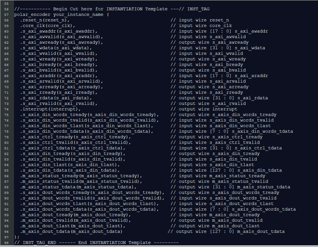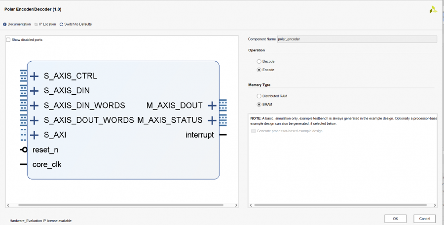 該Core使用AXI接口。AXI4-Lite存儲器映射總線用于參數(shù)(例如Polar碼定義)持續(xù)緩存多個(gè)塊,AXI4-Stream接口用于逐個(gè)樣本提供數(shù)據(jù)(例如,DIN)基于逐塊的配置(例如,CTRL)。這些接口處理提供數(shù)據(jù)外,還提供握手信號。