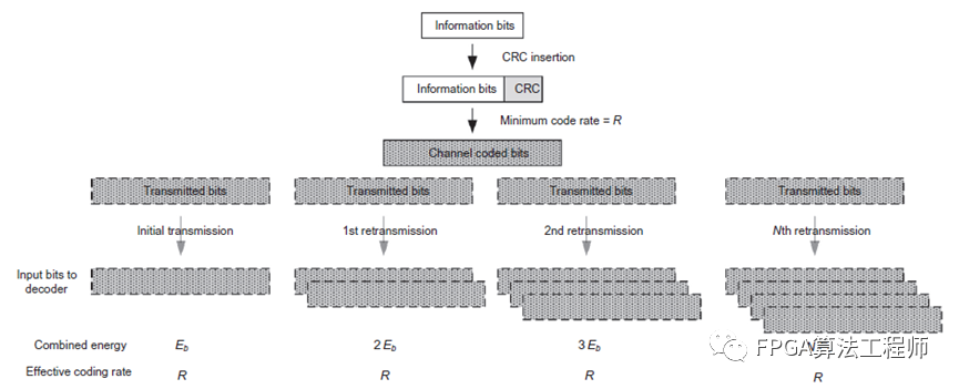 只要將兩種誤差控制方案適當地結合起來,就可以克服ARQ和FEC的缺點。為了提高分組傳輸的吞吐量和降低時延,將ARQ錯誤控制機制與FEC編碼相結合,設計了混合ARQ (HARQ)方案。HARQ系統由一個包含在ARQ系統中的FEC子系統組成。該方法通過對頻繁出現的錯誤進行修正,從而減少了平均重傳次數。然而,當檢測到較低頻率的錯誤時,接收方請求重傳,其中每次重傳都攜帶相同或一些冗余信息,以幫助數據包檢測。HARQ使用FEC來糾正接收端部分錯誤,并依靠錯誤檢測來檢測剩余的錯誤。大多數實用的HARQ方案使用CRC碼進行錯誤檢測,并使用某種形式的FEC來糾正傳輸錯誤,例如信道編解碼常用的Turbo碼或者LDPC碼。