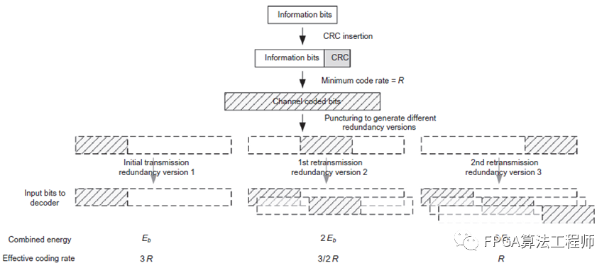 軟合并HARQ:在這種HARQ方案中,每次重傳都傳輸相同的數據包。采用軟合并可提高可靠性。在傳輸之前,數據塊和CRC碼一起使用FEC編碼器進行編碼。如果接收方無法正確解碼數據塊,則請求重新傳輸。當接收到重傳的編碼塊時,將其與先前接收到的對應于相同信息位的塊合并(例如使用最大比合并方法)并傳輸給解碼器。由于每次重傳都是原始傳輸的相同副本,因此每次重傳接收到的Eb/N0,即每信息位的能量除以噪聲譜功率密度,每次重傳都會增加,提高了正確解碼的可能性。在軟合并HARQ中,被編碼bit的冗余版本在每次傳輸中都不會改變。因此,打孔模式保持不變。接收端使用當前碼塊和之前所有的HARQ傳輸來解碼信息位。這個過程將會繼續(xù),直到信息位被正確解碼并通過CRC測試或達到HARQ重傳的最大數量。當達到最大重傳次數時,MAC子層重置該進程,繼續(xù)重新傳輸相同的碼塊。當一個進程在等待應答時,許多用于HARQ的并行通道可以幫助提高吞吐量;另一個進程可以利用信道傳輸子數據包。圖1說明了軟合并HARQ (HARQ- cc)方案的操作,以及相同編碼位的重傳如何在保持有效碼率不變的情況下改變每比特的合并能量Eb。