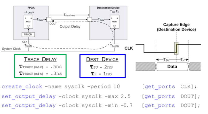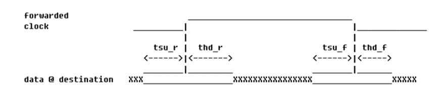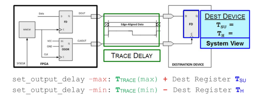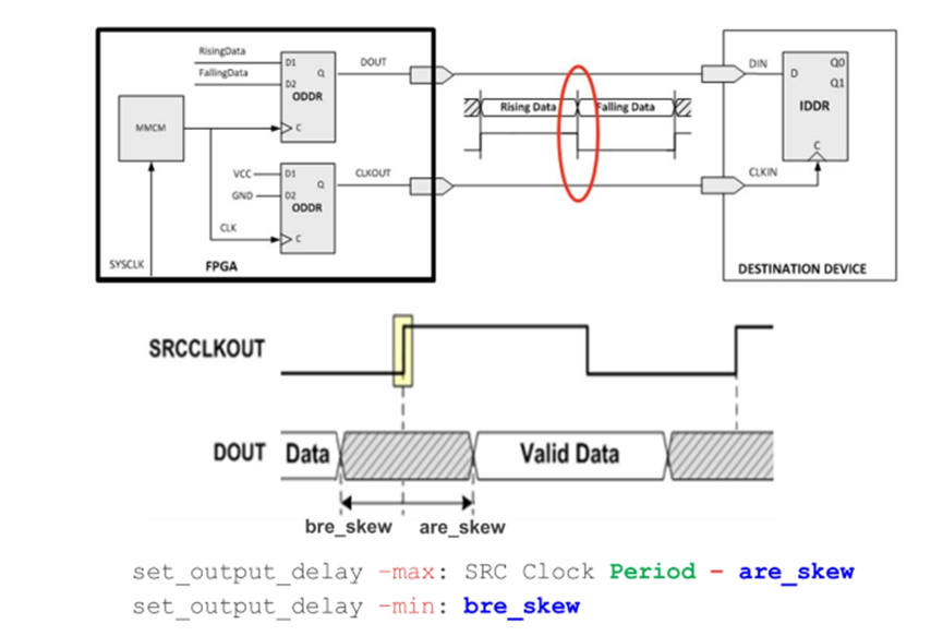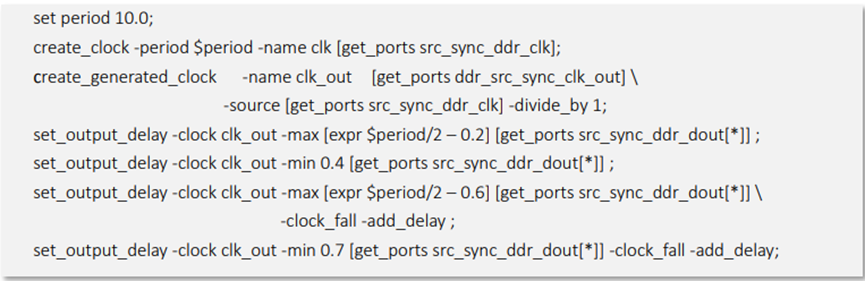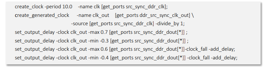 上圖是一個(gè) SDR 上升沿采樣系統(tǒng)同步接口的 Output 約束示例。其 中,-max 后的數(shù)值是板級(jí)延時(shí)的最大值與下游器件的 Tsu 相加而得出, -min 后的數(shù)值則是板級(jí)延時(shí)的最小值減去下游器件的 Th 而來。
