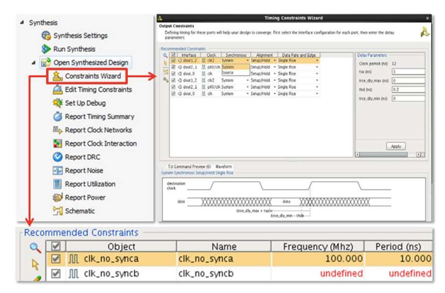 自 2014.1 版開始,Vivado 還提供一個(gè) Constraints Wizard 可供用戶使用。只需打開綜合后的設(shè)計(jì),然后啟動(dòng) Wizard,工具便可以根據(jù)讀到的網(wǎng)表和設(shè)計(jì)中已有的 XDC 時(shí)序約束(也可以任何約束都不加而開始用 Wizard)一步步指引用戶如何添加 Timing 約束,包括時(shí)鐘、I/O 以及時(shí)序例外約束等等。