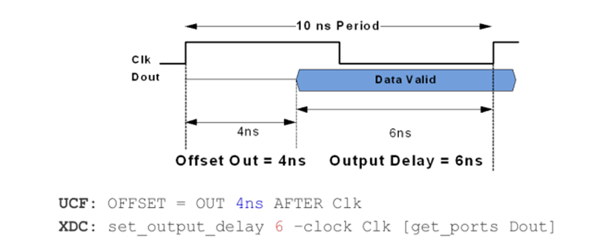 輸出側(cè)的設(shè)置,UCF 用的是 OFFSET =OUT,而 XDC 則是 set_output_delay 。
