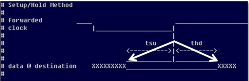 如果板級(jí)延時(shí)的最小值(在源同步接口中,因?yàn)闀r(shí)鐘與信號(hào)同步傳遞,所以板級(jí)延時(shí)常??梢砸曌鳛?/span> 0)小于接收端寄存器的 Th,這樣計(jì)算出的結(jié)果就會(huì)在 -min 后出現(xiàn)負(fù)數(shù)值,很多時(shí)候會(huì)讓人誤以為設(shè)置錯(cuò)誤。其實(shí)這里的負(fù)數(shù)并不表示負(fù)的延遲,而代表最小的延遲情況下,數(shù)據(jù)是在時(shí)鐘采樣沿之后才有效。同樣的,-max 后的正數(shù),表示最大的延遲情況下,數(shù)據(jù)是在時(shí)鐘采樣沿之前就有效了。