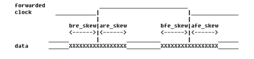 可以這樣計(jì)算輸出接口約束:時(shí)鐘的周期是 10ns,因?yàn)槭?/span> DDR 方式,所以數(shù)據(jù)實(shí)際的采樣周期是時(shí)鐘周期的一半;上升沿采樣的數(shù)據(jù)的 -max 應(yīng)該是采樣周期減去這個(gè)數(shù)據(jù)的發(fā)送沿(下降沿)之后的數(shù)據(jù) skew 即 afe_skew,而對(duì)應(yīng)的-min 就應(yīng)該是上升沿之前的數(shù)據(jù) skew 值bre_skew ;同理,下降沿采樣數(shù)據(jù)的 -max 應(yīng)該是采樣周期減去這個(gè)數(shù)據(jù)的發(fā)送沿(上升沿)之后的數(shù)據(jù) skew 值 are_skew,而對(duì)應(yīng)的-min 就應(yīng)該是下 降沿之前的數(shù)據(jù) skew 值 bfe_skew 。