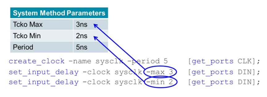 上圖所示 set_input_delay 的基本語法中,是想要設(shè)定 input 約束的端口名,可以是一個或數(shù)個 port;-clock 之后的指明了對時序進(jìn)行分析所用的時鐘,可以是一個 FPGA 中真實存 在的時鐘也可以是預(yù)先定義好的虛擬時鐘;-max 之后的描述了用于setup分析的包含有板級走線和外部器件的延時;-min 之后的描述了用于 hold 分析的包含有板級走線和外部器件的延時。