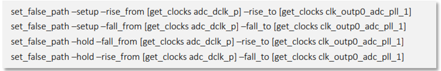 另外,在經(jīng)過 MMCM/PLL 相移后的采樣時鐘跟同步接口輸入的時鐘之間需要做set_false_path 的約束(如下述例子)而把那些偽路徑從時序報告中剔除,這里不再詳述。