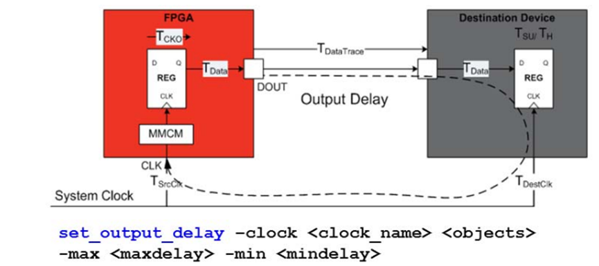 上圖所示 set_output_delay 的基本語法中,是想要設(shè)定 output 約束的端口名,可以是一個或 數(shù)個 port;-clock 之后的指明了對時序進(jìn)行分析所用的時鐘,可以是一個 FPGA 中真實存在的時鐘也可以是預(yù)先定義好的虛擬時鐘;-max 之后的描述了用于 setup 分析的包含有板級走線和外部器件的延時;-min 之后的描述了用于 hold 分析的包含有板級走線和外部器件的延時。