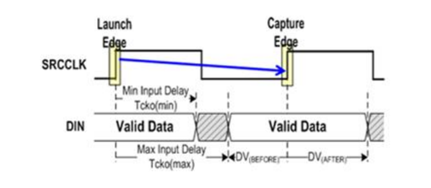 設(shè)置和分析 I/O 約束一定要有個系統(tǒng)級思考的視角,如上右圖所示,Launch Edge 對應(yīng)的是上游器件的時 鐘,而 Capture Edge 則對應(yīng) FPGA 的輸入時鐘,正因為是系統(tǒng)同步時鐘,所以可以將其視作完全同步而放在一張圖上分析,這樣一來,就可以用一般時序分析方法來看待問題。