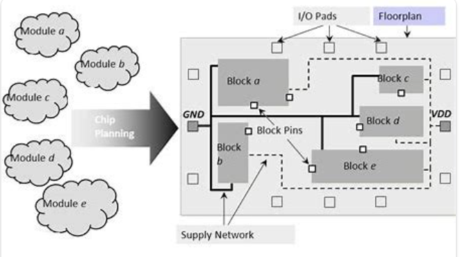 在電路原理圖中,我們通常只看到一個(gè)“Vdd”和一個(gè)’Vss’,表示電源和地。但是,在芯片上,我們需要構(gòu)建一個(gè)電源網(wǎng)絡(luò),將電源和地分布到各個(gè)模塊。在floorplan階段,我們還需要放置引腳(pin)或焊盤(pán)(pad),用于與外部設(shè)備連接。引腳是模塊級(jí)別的接口,焊盤(pán)是芯片級(jí)別的接口。