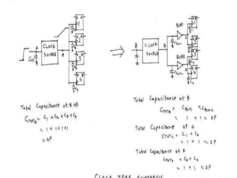因?yàn)楣?jié)點(diǎn)’B’的電容超過(guò)了2F,工具就會(huì)用2個(gè)buffer把節(jié)點(diǎn)’B’的負(fù)載分開(kāi),就像圖上那樣。它從庫(kù)里選buffer(假設(shè)每個(gè)buffer的輸入電容是1F),并建一個(gè)樹(shù)(時(shí)鐘樹(shù)),來(lái)滿(mǎn)足設(shè)計(jì)的最大電容約束。這個(gè)過(guò)程叫做’時(shí)鐘樹(shù)綜合(Clock tree synthesis)'。