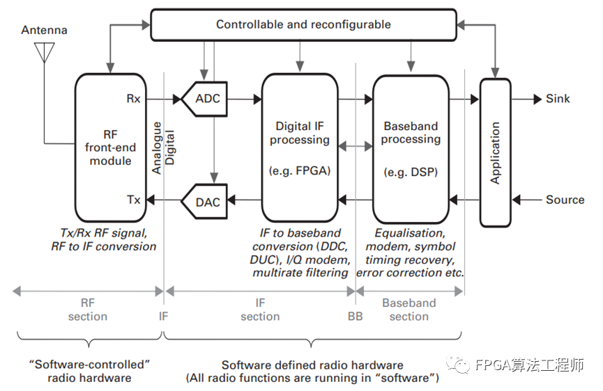 在通信系統(tǒng)中,DDC和DUC是射頻前端(DFE)中的重要組成部分。圖1示出了一個超外差架構(gòu)的數(shù)字無線電收發(fā)器示例。這是一個雙級轉(zhuǎn)換架構(gòu),其中,在第一階段,射頻(RF)信號被下轉(zhuǎn)換為中頻(IF),然后,在第二階段,它被從中頻轉(zhuǎn)換為基帶信號。如圖所示,射頻、中頻和基帶部分的硬件部分是由軟件控制和可重構(gòu)的。這種無線電收發(fā)器架構(gòu)被稱為軟件定義無線電(SDR)。