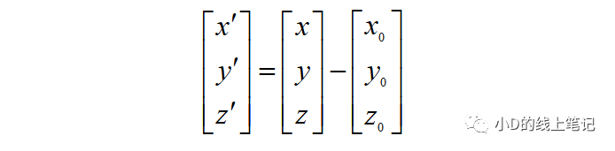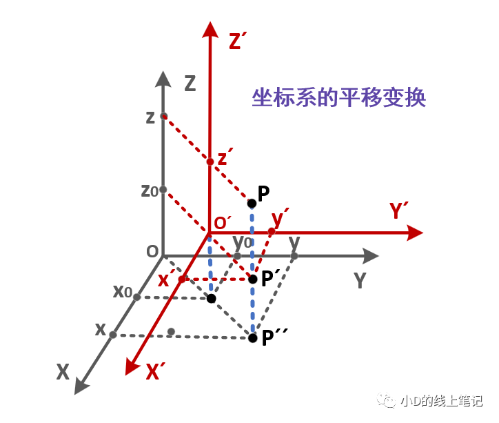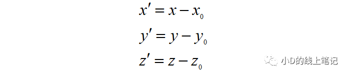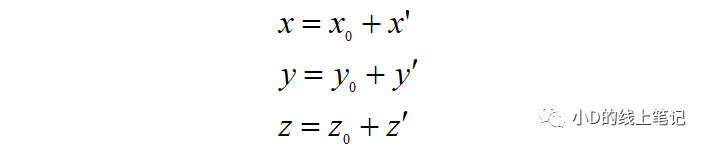 假設點P是空間中的任意一點,其在XYZ坐標系中的坐標為(x, y, z)?,F(xiàn)在點P不動,我們將XYZ坐標系做一個平移的操作,把XYZ平移到X′Y′Z′的位置,O′是平移后的坐標的原點,要注意的是,O′在XYZ中的坐標為(x0, y0, z0)。點P在XYZ坐標系中的坐標為(x, y, z),點P在平移后的坐標系X′Y′Z′中的坐標為(x′, y′, z′)。根據(jù)上面這個示意圖,聰明的你一下就可以發(fā)現(xiàn):