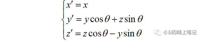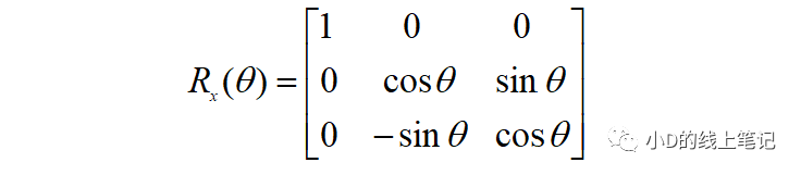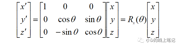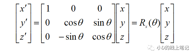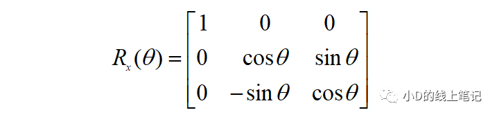 上面的Rx就是XYZ右手坐標系繞X軸逆時針旋轉(zhuǎn)θ角,空間中的點從XYZ坐標系變換到X′Y′Z′坐標系的旋轉(zhuǎn)矩陣,Rx的表達式為: