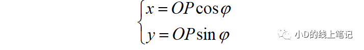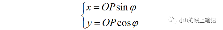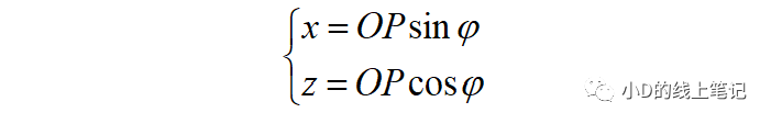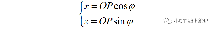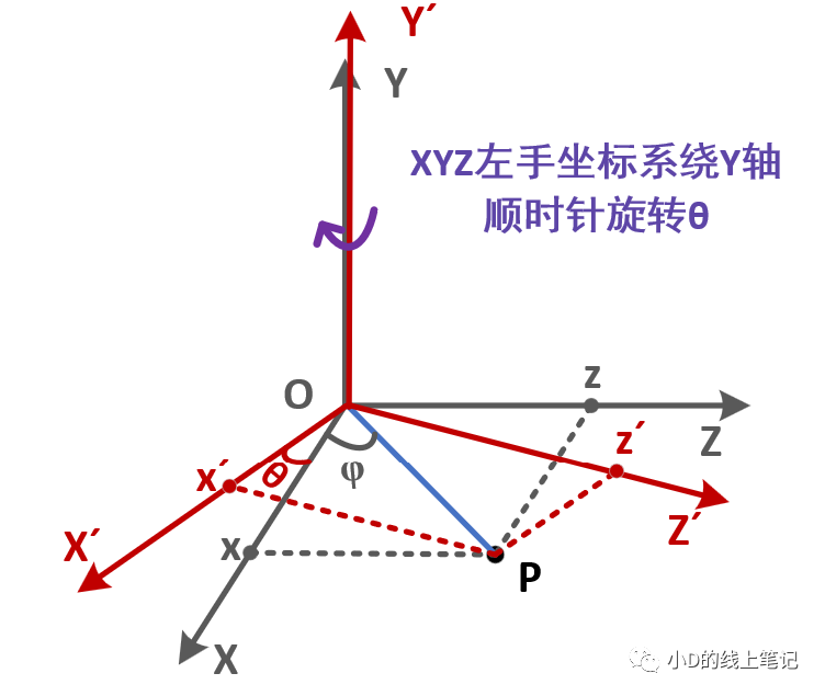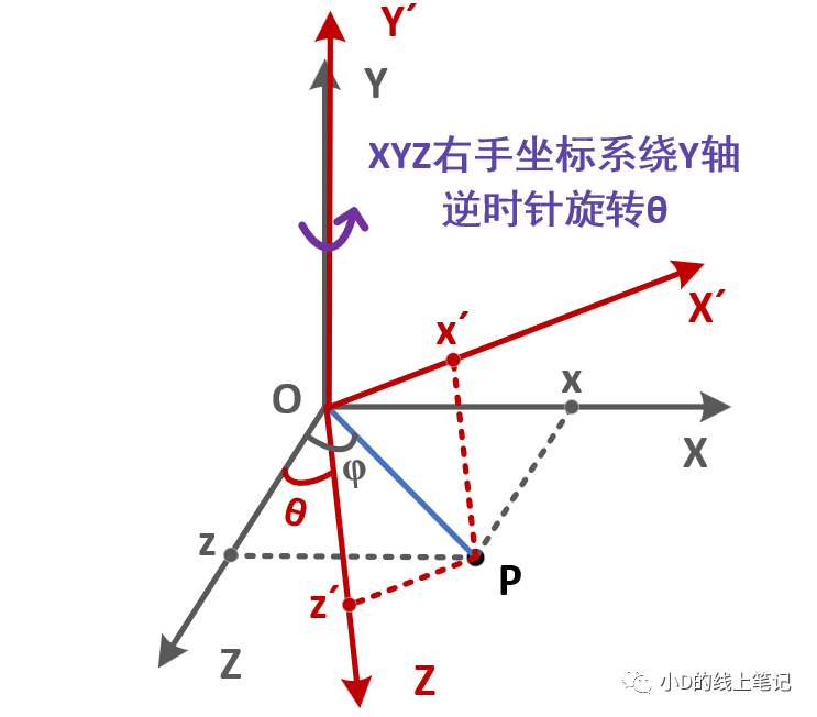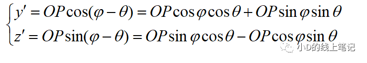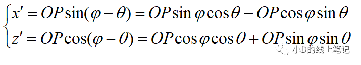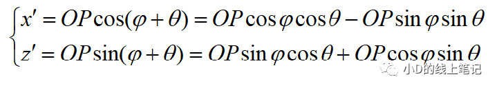 把x,z帶入x′,z′中,同時P點在XYZ中的Y軸坐標與X′Y′Z′坐標系中的Y′軸坐標是相等的,所以有: