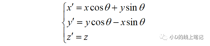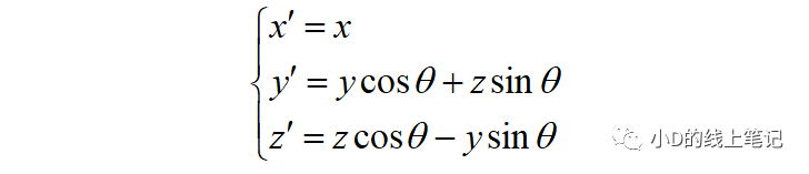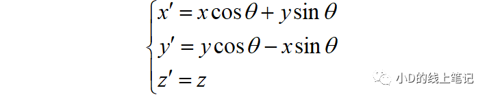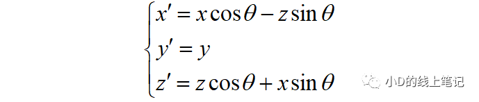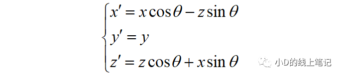 把x,z帶入x′,z′中,同時P點在XYZ中的Y軸坐標與其在X′Y′Z′坐標系中的Y′軸坐標是相等的,所以有: