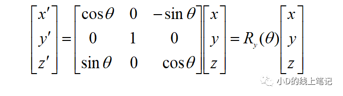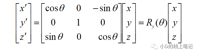 所以,XYZ左手坐標系繞Y軸順時針旋轉(zhuǎn)θ角的旋轉(zhuǎn)矩陣Ry為: