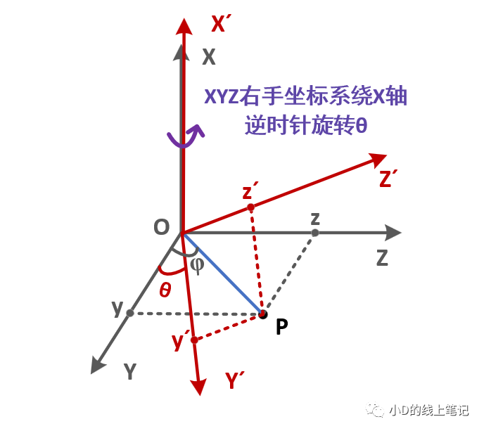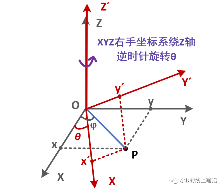 XYZ右手坐標系繞Z軸逆時針旋轉(zhuǎn)θ的過程如下圖所示: