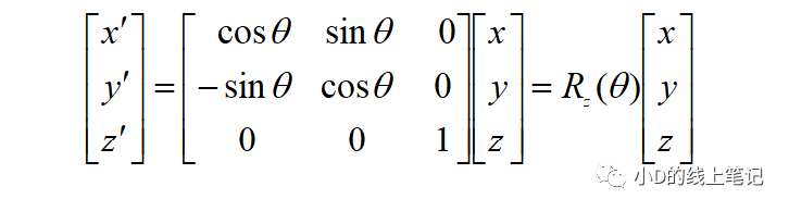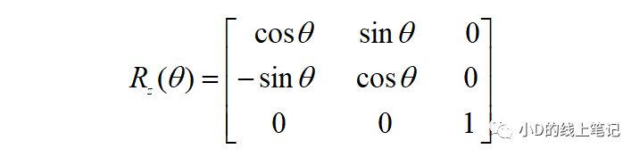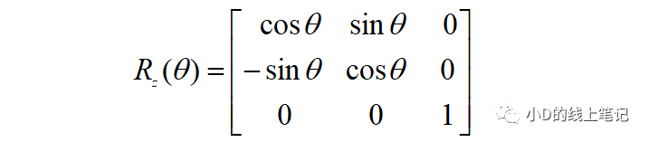 所以,XYZ右手坐標系繞Z軸逆時針旋轉(zhuǎn)θ角的旋轉(zhuǎn)矩陣Rz為: