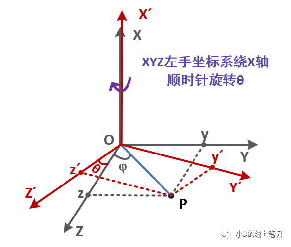上圖中,點P為空間中任意一點,點P保持不動,XYZ左手坐標系繞X軸順時針旋轉(zhuǎn)θ角形成新的坐標系X′Y′Z′。已知點P在XYZ坐標系中的坐標為(x,y,z),點P在X′Y′Z′中的坐標為(x′,y′,z′),我們要求的是XYZ坐標系變換到X′Y′Z′坐標系這個過程中的旋轉(zhuǎn)矩陣。