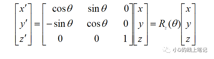 所以,XYZ左手坐標系繞Z軸順時針旋轉(zhuǎn)θ角的旋轉(zhuǎn)矩陣Rz為: