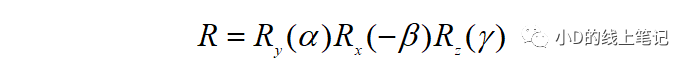 比如對于右手坐標系,如果有一個過程是先繞Y軸逆時針旋轉(zhuǎn)α,再繞X軸順時針旋轉(zhuǎn)β,最后繞Z軸逆時針旋轉(zhuǎn)γ,那么最終的旋轉(zhuǎn)矩陣的表達就是: