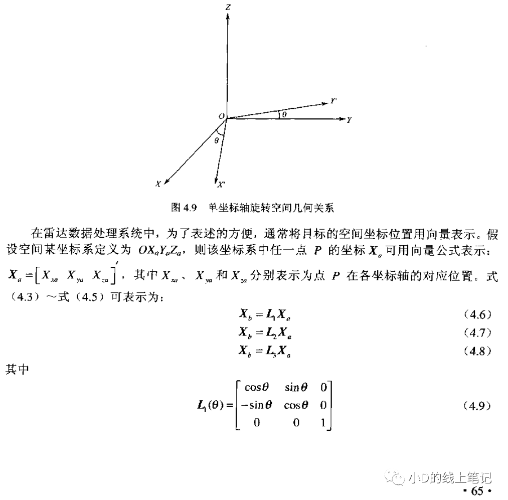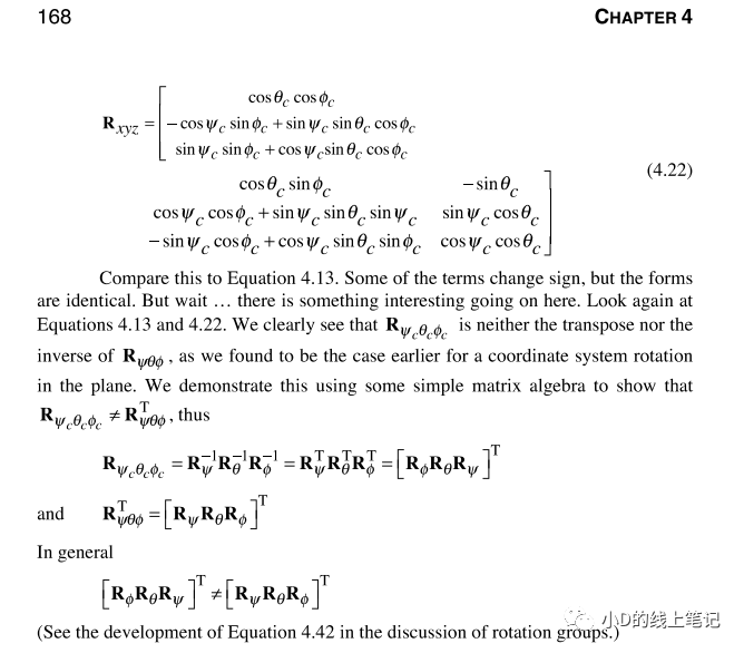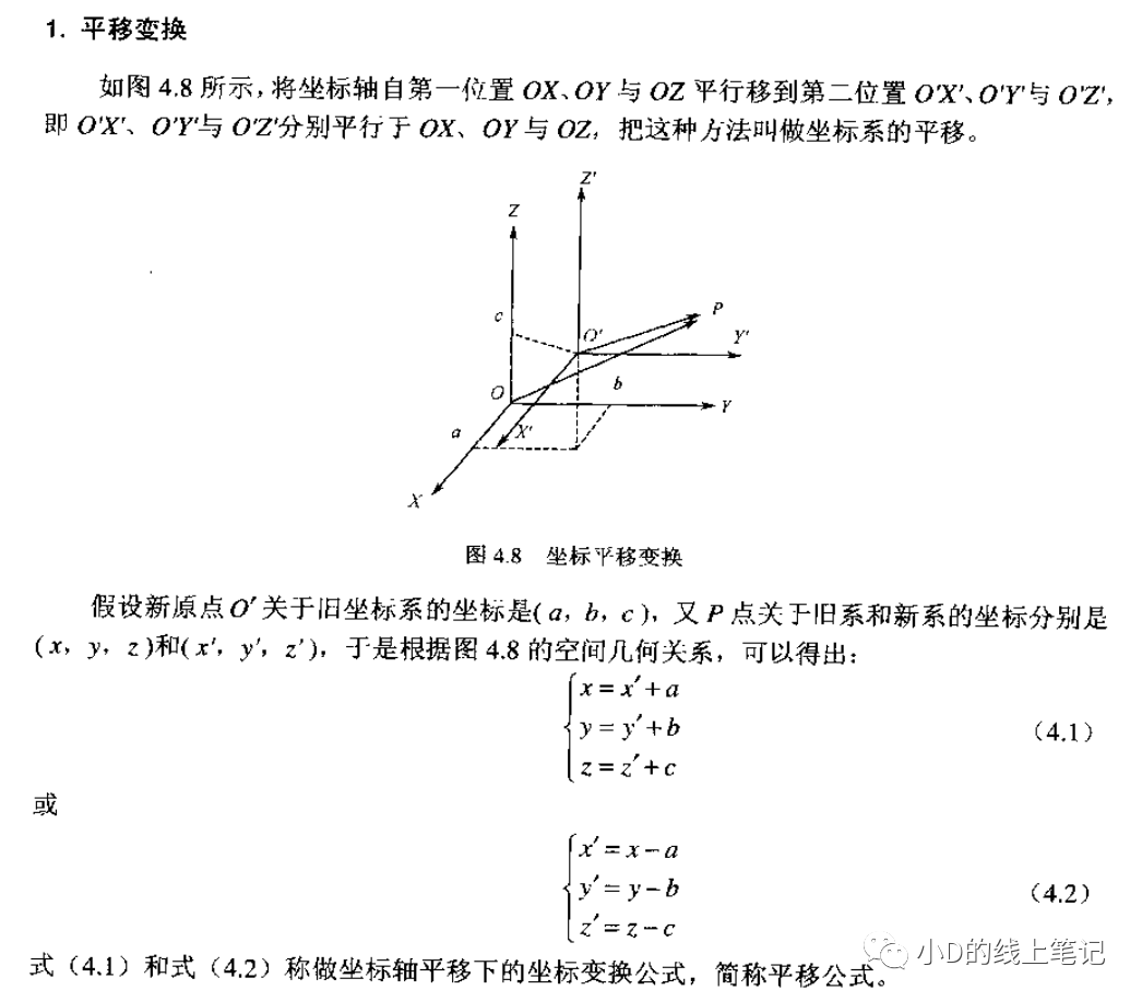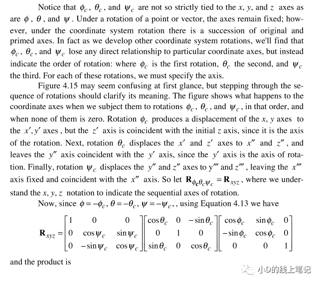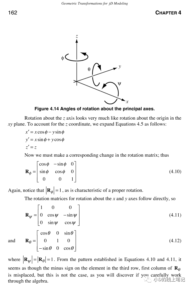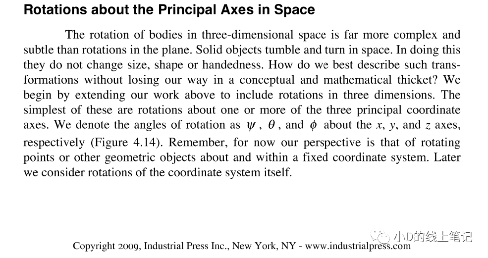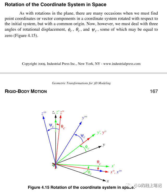 gpt4的回答和gpt3.5的回答如出一轍,當時小D心想,gpt腦子估計又瓦特了。直到最近,小D看到了一本英文書籍Geometric Transformations for 3D Modeling_Michael Mortenson,小D才明白,原來gpt是沒有正確理解問題,它給出的是坐標系中的點轉(zhuǎn)動,坐標軸不動的情況。這本英文書籍中坐標轉(zhuǎn)換相關的內(nèi)容是這樣的: