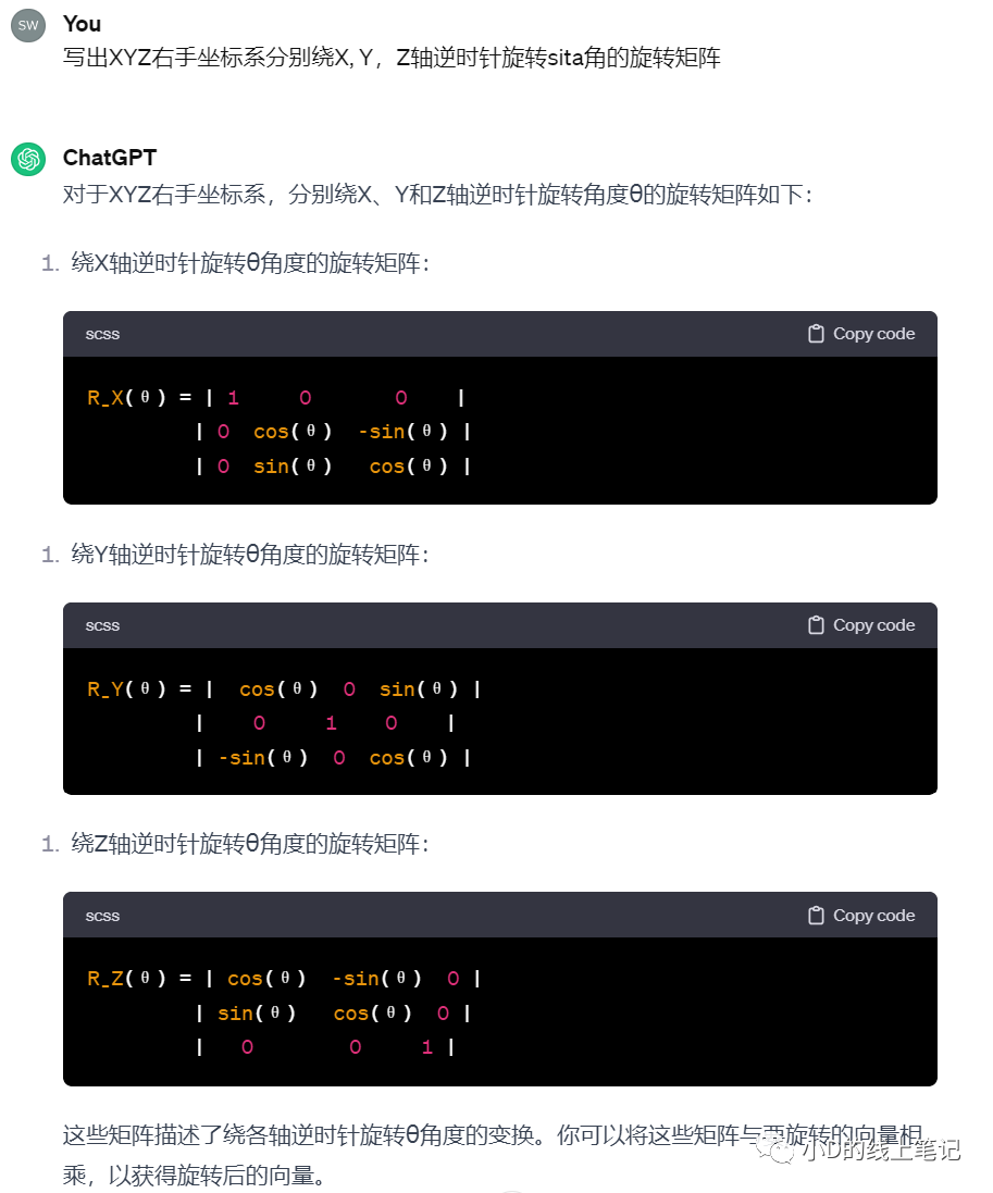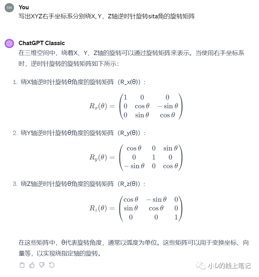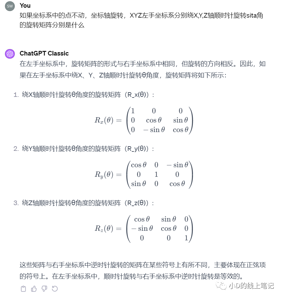 很顯然,gpt給出的右手坐標系的旋轉(zhuǎn)矩陣不是小D上面推導的結(jié)果,也跟書中的結(jié)果不一樣。于是小D又去問了gpt4,gpt4的回答是這樣的: