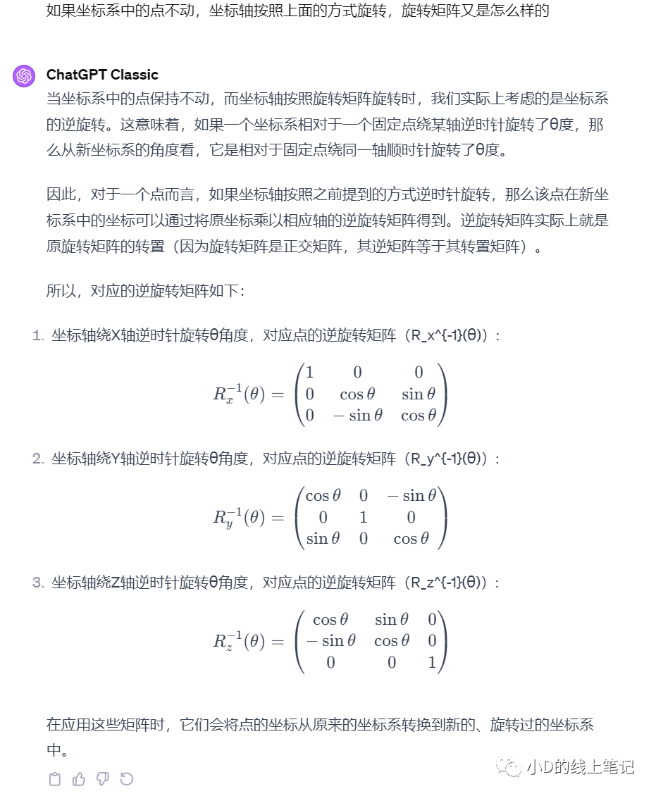 以另一種方式問它,它就回答對了“點不動,坐標軸旋轉(zhuǎn)”的旋轉(zhuǎn)矩陣正確的公式: