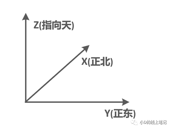 ENU坐標(biāo)系中的E表示East,N表示North,U表示Up,翻譯過(guò)來(lái)就是東北天坐標(biāo)系,小D第一次看到東北天這個(gè)名字時(shí),還以為這個(gè)坐標(biāo)系跟咱們祖國(guó)大東北有啥關(guān)系,后來(lái)發(fā)現(xiàn)沒(méi)有關(guān)系。