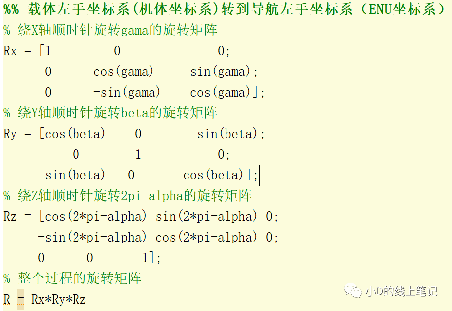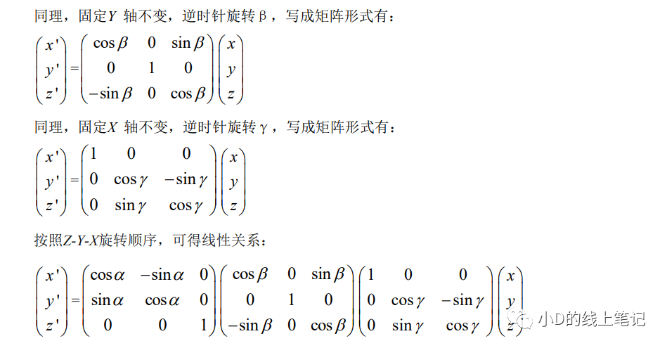 除此之外,小D覺(jué)得文獻(xiàn)中給出的繞X,Y,Z軸逆時(shí)針旋轉(zhuǎn)的旋轉(zhuǎn)矩陣是有點(diǎn)問(wèn)題的,正確的旋轉(zhuǎn)矩陣小D在上篇公眾號(hào)文章中給出了,大家可以對(duì)比一下,如果你覺(jué)得小D的觀點(diǎn)有問(wèn)題,也可以告訴小D。