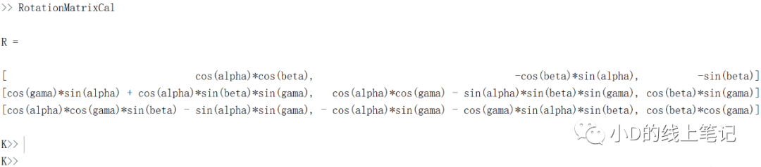 代碼計(jì)算結(jié)果如上圖所示,和作者計(jì)算的不一樣,字體有點(diǎn)小,大家可以自己在matlab里驗(yàn)證旋轉(zhuǎn)矩陣計(jì)算結(jié)果。