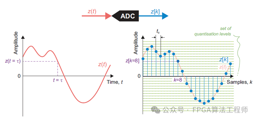 如圖1左側(cè)所示,模擬信號(hào)被認(rèn)為是連續(xù)時(shí)間的,這意味著它的幅度是在所有時(shí)間內(nèi)定義的,可以在任意時(shí)間點(diǎn)測(cè)量或表示。