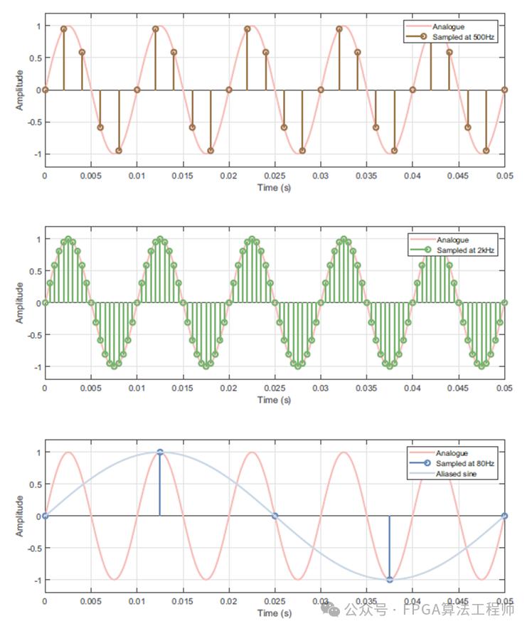 適當(dāng)采樣頻率的選擇主要受待處理信號(hào)的頻率含量的影響。采樣太慢,信號(hào)信息不能被正確捕獲;采樣太快,處理信號(hào)所需的操作不必要地膨脹。舉一個(gè)簡(jiǎn)單直觀的例子,考慮如圖2所示的100正弦波,它以三種不同的速率采樣。