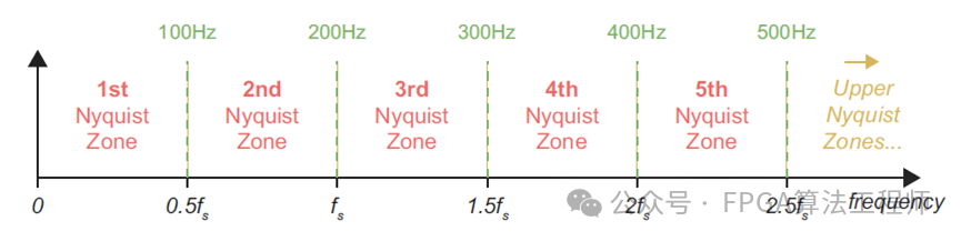 混疊以基于奈奎斯特區(qū)域(Nyquist Zones)的規(guī)則模式發(fā)生,這是頻域中帶寬為0.5的分區(qū)。根據(jù)奈奎斯特采樣定理,可以定義任意數(shù)量的奈奎斯特區(qū)域,但只能直接表示第一個(gè)奈奎斯特帶中的采樣信號(hào)。由于混疊,出現(xiàn)在較高奈奎斯特區(qū)域中的任何信號(hào)分量都被“折疊”到第一奈奎斯特區(qū)域中。