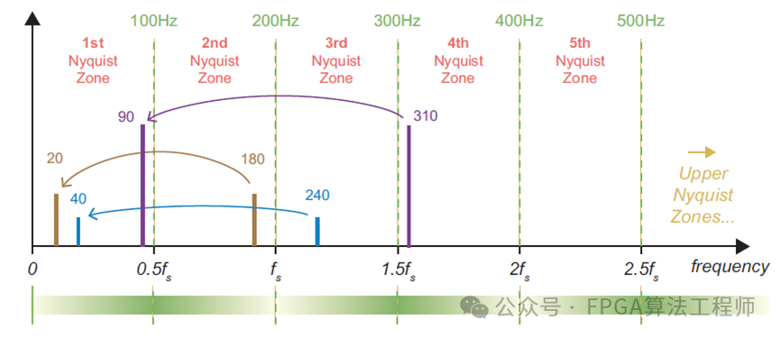 為了考慮一些簡(jiǎn)單數(shù)字的例子,讓我們假設(shè)采樣率為200。Nyquist Zone的寬度為100,其中第一個(gè)Nyquist Zone的范圍從0到100,第二個(gè)Nyquist Zone的范圍從100到200,以此類推,如圖4所示。