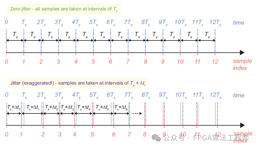 到目前為止,我們所有的采樣都假設(shè)樣本是完全定時(shí)的,在時(shí)間上有一致的分離。在實(shí)踐中,ADC并不以這種完美的方式工作,并且在樣本之間的周期應(yīng)該有一些變化,如圖7所示(注意,為了可視化的目的,采樣周期的變化程度被夸大了)。