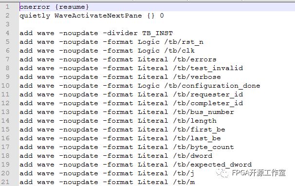 圖5 為wave.do文件,這個(gè)文件被tb.fdo文件調(diào)用,主要是增加波形信號(hào)。