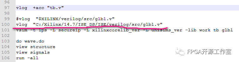 圖4 是tb.fdo文件里邊是我們重點(diǎn)學(xué)習(xí)的腳本語句,如何增加verilog文件,大家一看便知。