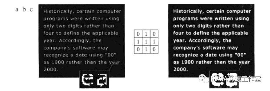如圖1所示,a為具有斷裂文字的低分辨率樣品文字(見放大的視圖),b為結(jié)構(gòu)元,c為圖b對(duì)a的膨脹。斷裂線段被連接起來了。