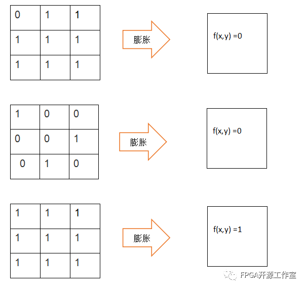 只有(x,y)點(diǎn)以及相鄰的八個(gè)點(diǎn)都是‘1’f(x,y)的值才是‘1’。這樣就完成了二值圖像的膨脹。