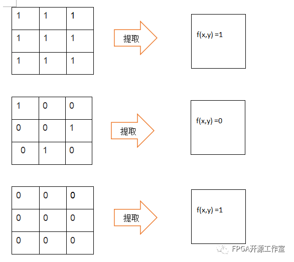 我們使用3x3模板進行邊界提取,所以當3x3九個點都是‘1’的時候,輸出為‘1’,當九個點都是‘0’的時候,輸出為‘1’,其他情況輸出均為‘0’。