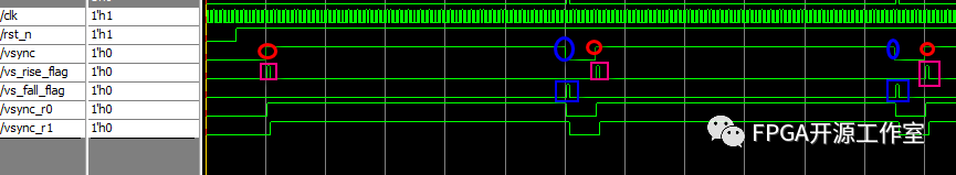 如上圖所示,紅色的圓圈表示vsync的上升沿,紅色正方形框表示vsync的上升沿標志;藍色的圓圈表示vsync信號的下降沿,藍色框表示vsync的下降沿標志。