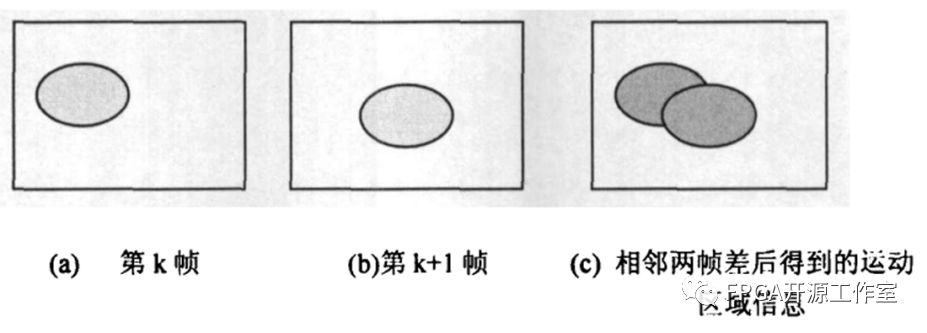 如圖可見,由目標(biāo)運(yùn)動引起的運(yùn)動變化區(qū)域包括運(yùn)動目標(biāo)在前后兩幀中的共同位置(圖中黑色區(qū)域)、在當(dāng)前幀中新顯露出的背景區(qū)域和新覆蓋的背景區(qū)域三部分。