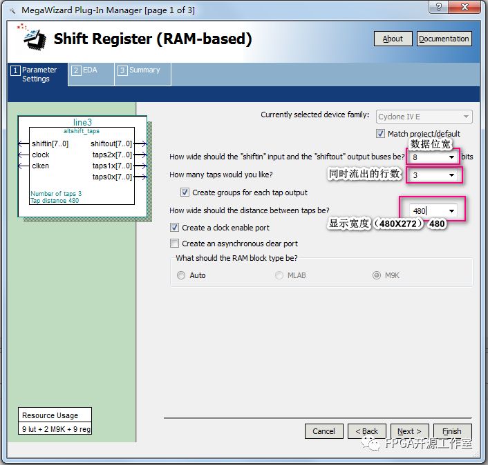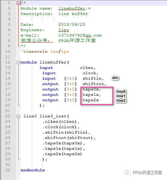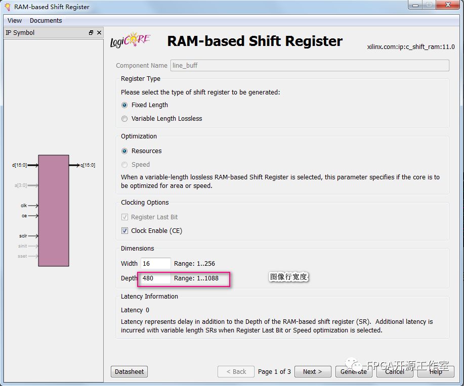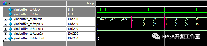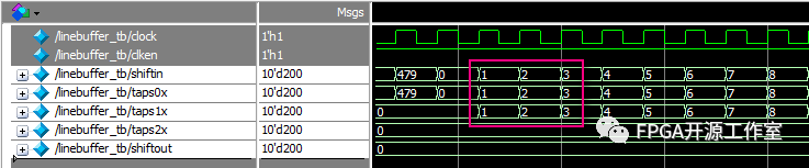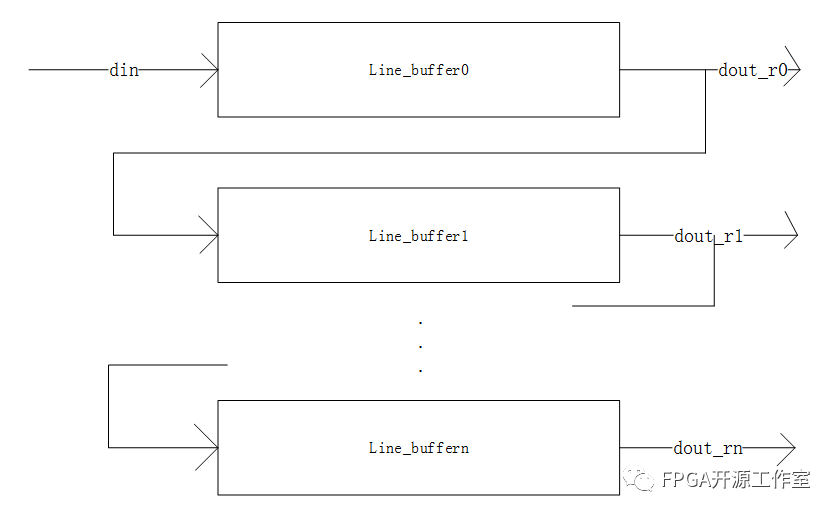 如圖1所示,我們要設(shè)計(jì)n行同時(shí)輸出,就串聯(lián)n行。Line_buffer的大小設(shè)置由圖像顯示行的大?。▓D像寬度)決定。例如480*272 (480)。