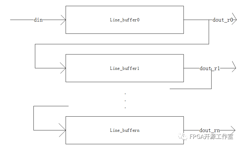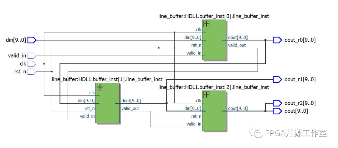 如圖3所示,整個(gè)linebuffer由3個(gè)line_buffer組成,最終輸出3行緩存數(shù)據(jù)。