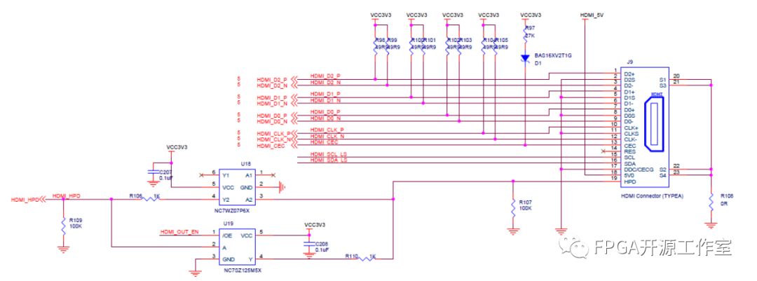 上圖所示,HDMI接口有3對(duì)數(shù)據(jù)差分信號(hào)、一對(duì)時(shí)鐘差分信號(hào)、HDMI_CEC(HDMI遙控器信號(hào))、HDMI IIC信號(hào)、HDMI_HPD(HDMI熱插拔檢測(cè)信號(hào))和HDMI_OUT_EN(HDMI電源輸出控制)。本節(jié)設(shè)計(jì)將把RGB888轉(zhuǎn)化為HDMI信號(hào)輸出來控制顯示屏的顯示。