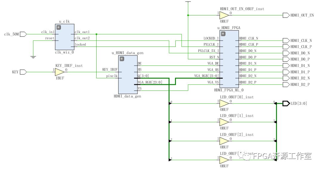 這個(gè)模塊我們采用IP。具體代碼有興趣的同學(xué)可以研究研究。VGA轉(zhuǎn)HDMI的內(nèi)部模塊如下圖。