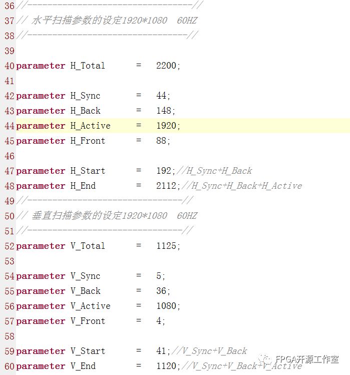 HDMI_data_gen模塊主要產(chǎn)生VGA的時(shí)序和測(cè)試圖像。我們這里采用1920x1080@60HZ。時(shí)序參數(shù)如下圖所示。